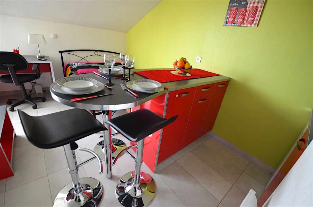 La journée un lit escamotable en 140 se range au plafond automatiquement et procure un gain de place optimal, les appartements au 2ième étage dispose d'un lit double 140cm;